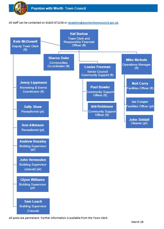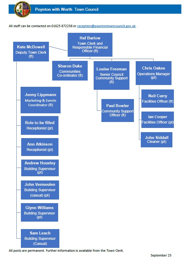 All of our town council staff can be contacted at: Civic Hall, off Park Lane, Poynton SK12 1RB, by telephone: 01625 872238 or reception@poyntontowncouncil.gov.uk