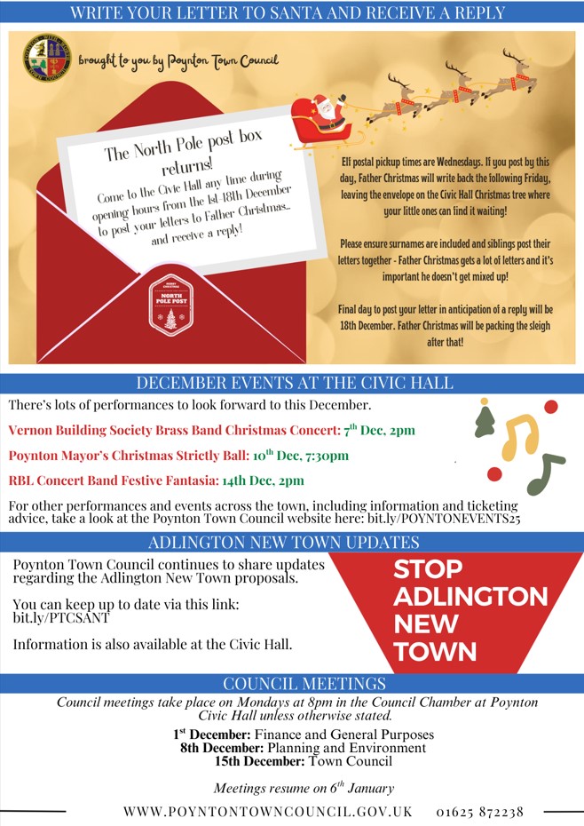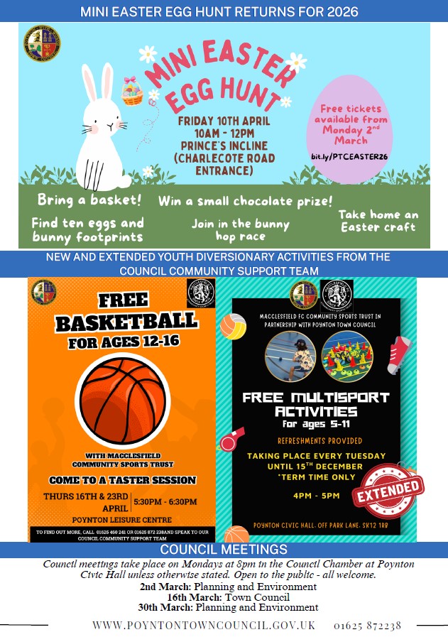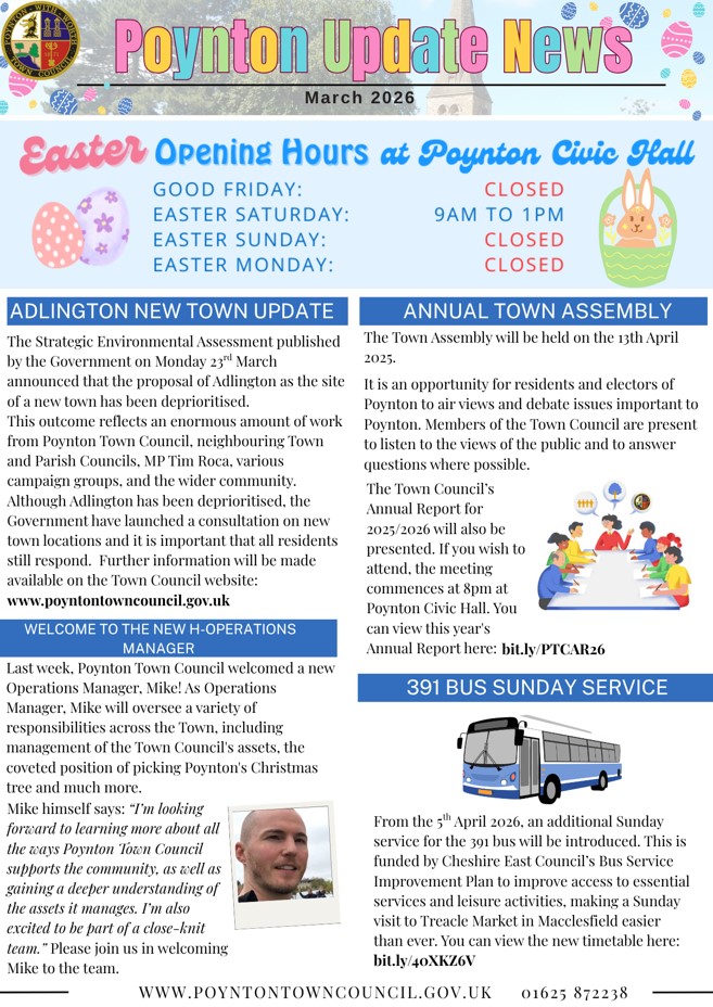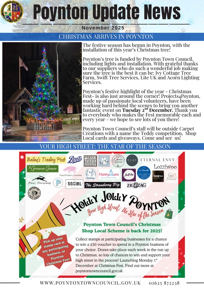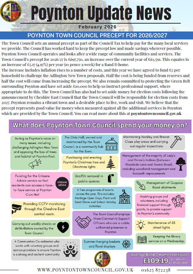 Town Council produces a local newsletter (Poynton Update and News PUN) every month. It includes council information, local news stories and details of