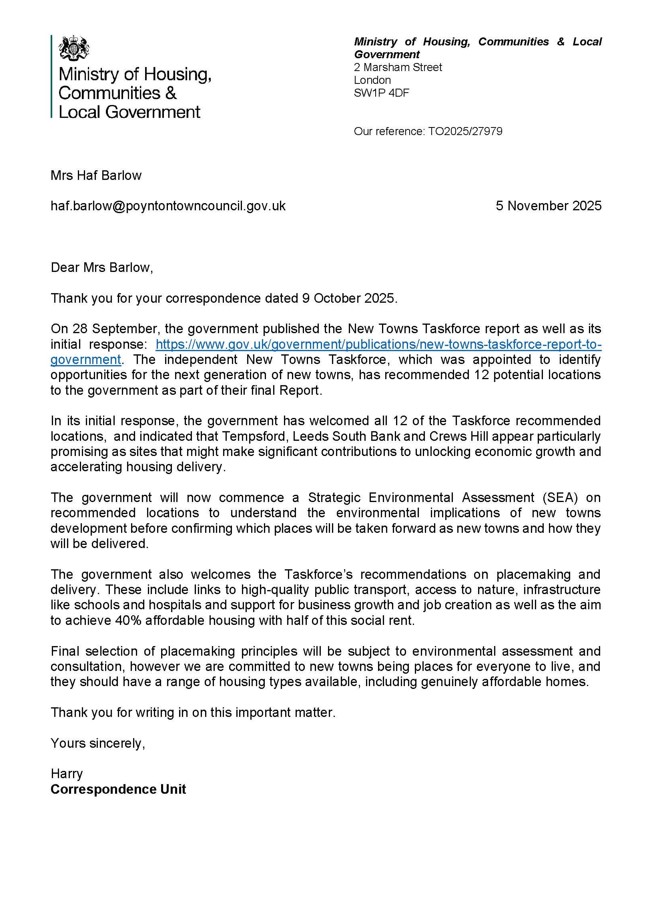 Poynton Town Council was concerned to learn of the Government’s proposals for “new towns” and the large-scale development of 14,000 – 20,000 new houses at Adlington. Whilst not in the boundary of Poynton, this development in a small neighbouring parish is likely to have a significant impact on Poynton.